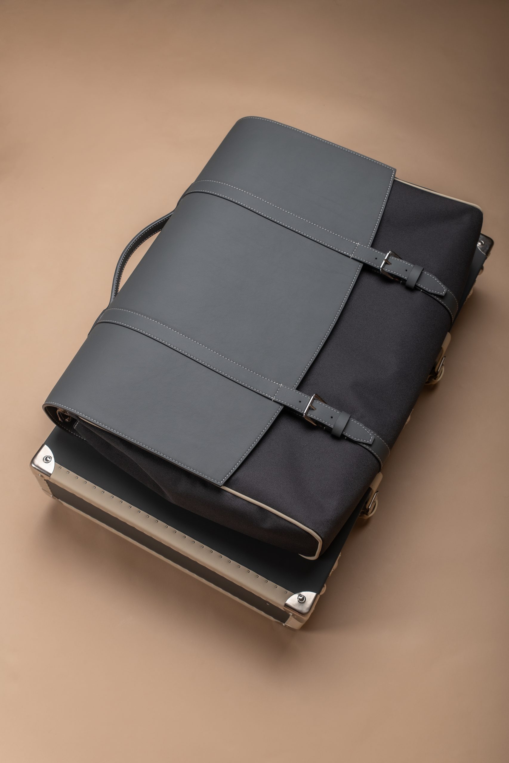 - Handles, corners, straps, and labels are also in leather.